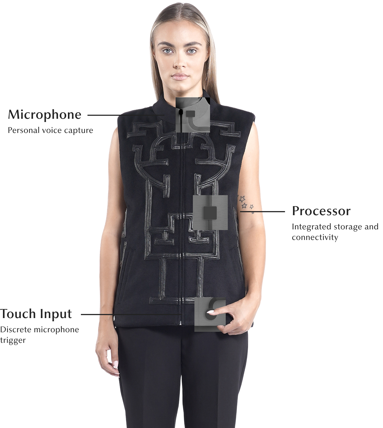 Activate the microphone through the touch button in the hem. Feel a vibration when the action is complete.